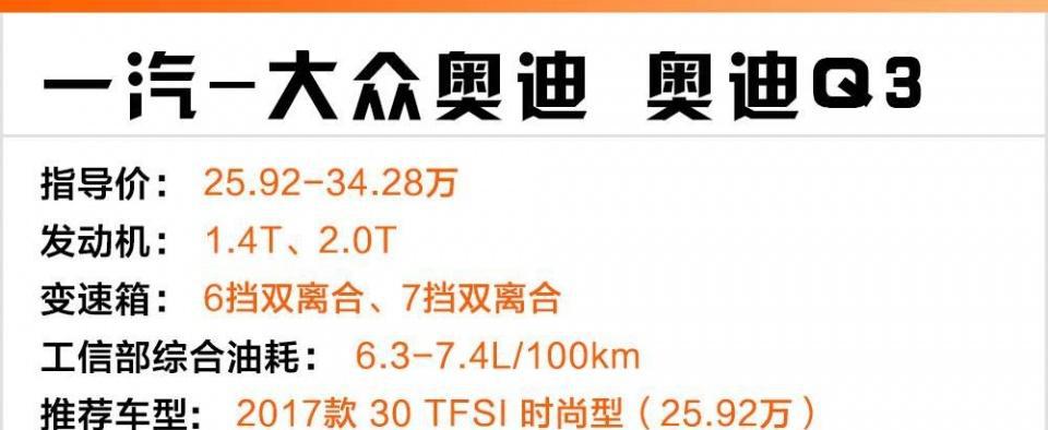 奥迪Q3指导价:24.90-34.28万元改款后的奥迪Q3,在外形上更加的年轻动感,吸引了更多年轻消费者的喜欢。带有着银色涂装的六边形进气格栅,让前脸看起来更有气势。
